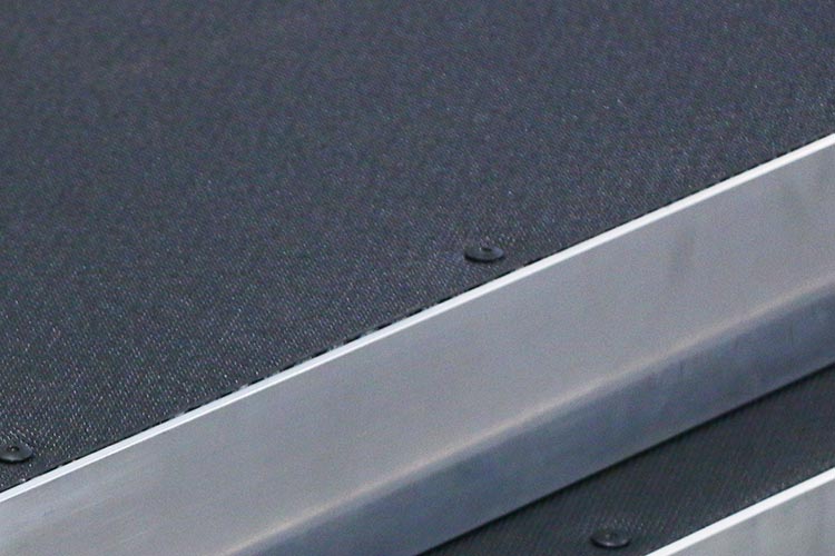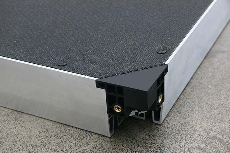 Las esquinas de los paneles del escenario están envueltas con componentes de goma resistentes al desgaste para evitar impactos.