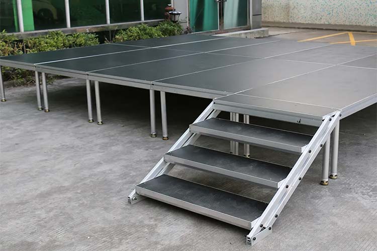 Los paneles de aluminio antideslizantes también son una opción muy común para los paneles de escenario. Es duro y fuerte, liso y fácil de limpiar. La superficie también se puede personalizar con varios patrones. Pero en comparación con algunos materiales para pisos tradicionales, su costo es mayor y, lo que es más importante, no es adecuado para ambientes fríos o calientes. Cuando la temperatura ambiente es baja, el panel de aluminio antideslizante puede congelarse, perdiendo así su efecto antideslizante e incluso aumentando los riesgos para la seguridad. Al mismo tiempo, el aluminio tiene una fuerte conductividad térmica. Cuando la temperatura ambiente es demasiado alta, el escenario se sobrecalentará fácilmente. Y cuando la temperatura sea baja, serán necesarias medidas de aislamiento adicionales.