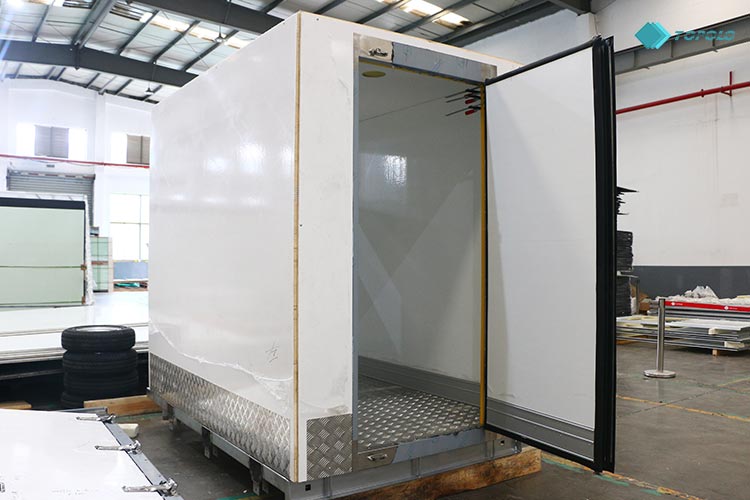 - Construcción ligera: La carrocería está fabricada con materiales compuestos de FRP, lo que facilita su remolque y maniobrabilidad en comparación con camiones frigoríficos de mayor tamaño.